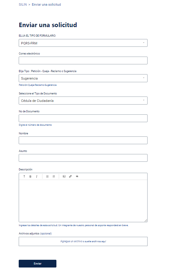 PQRS se define como una petición , queja, reclamo o sugerencia., para colocar una de éstas debe dirigirse al Centro de Ayuda Silin ingresar con su usuario y contraseña , después debera ingresar a "Enviar Solicitud PQRS", debe elegir el tipo de formulario: PQRS-FRM y llenar todos los campos requeridos según la imagen a continuación: