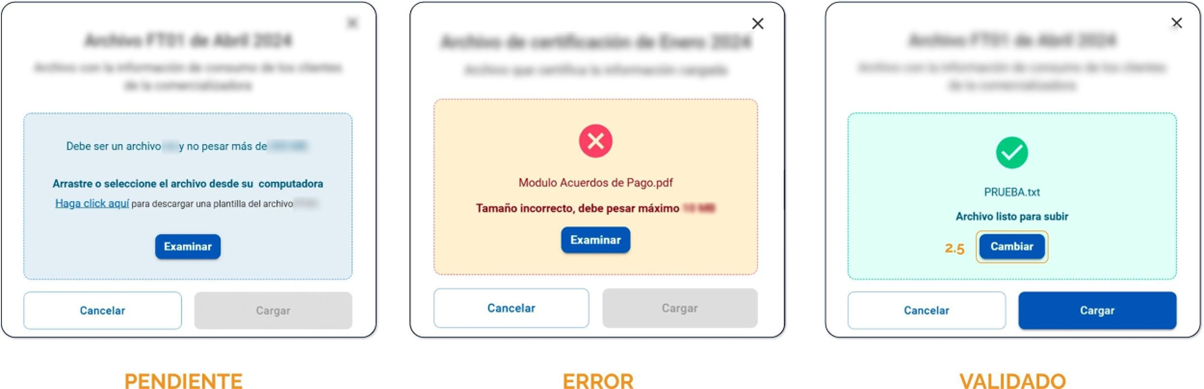 Cargar: si el archivo aún no ha sido cargado, estará disponible el botón de cargar, que al accionarse se despliega la ventana modal de cargue del archivo FT-02, la cual se describe en dicha sección con mayor detalle.