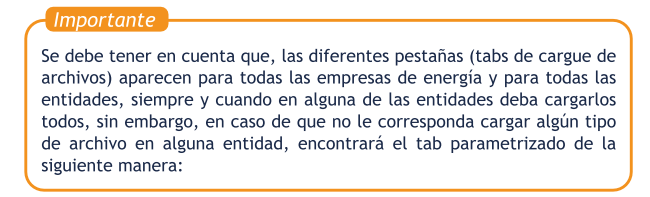 Se reflejará el mensaje “Este cargue no aplica para la entidad”. De manera general, tener en cuenta que, si su empresa cumple con los siguientes criterios aparecerán dichos tabs como disponibles para cargue: