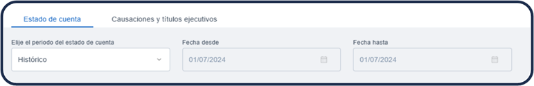 1. Filtros de periodo del estado de cuenta: es una barra desplegable que cuenta con 4 opciones de tiempos los cuales son: Año, Mes, Personalizado e Histórico y una barra de selección o campos de tiempo los cuales aparecen dependiendo de la opción que se escoja. Se debe seleccionar una de las opciones, dependiendo de la selección la “barra” cambiará: