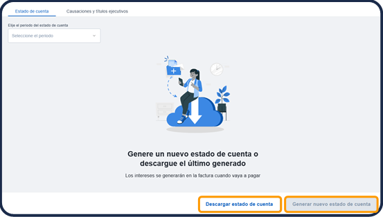 Botón “Generar nuevo estado de cuenta”: al posicionar el cursor sobre este botón aparece el mensaje “Estado de cuenta actualizado”. Para la activación se debe seleccionar un nuevo periodo en la barra desplegable y los tiempos si se requiere.