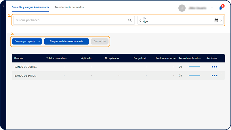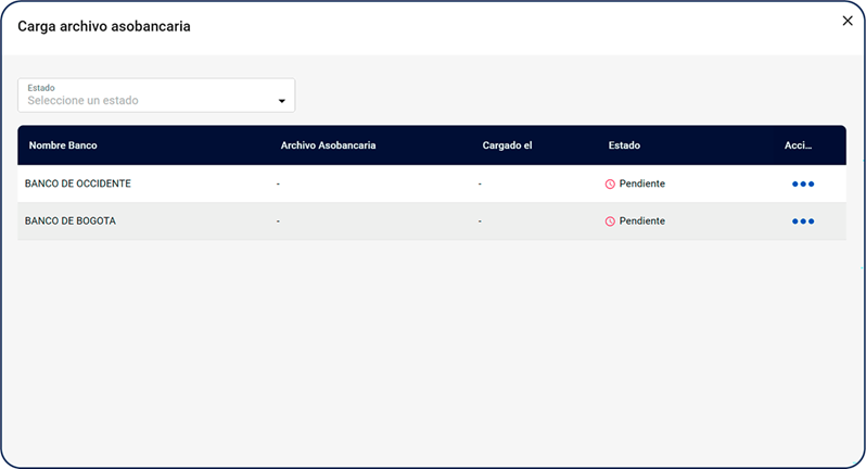 Bancos de la entidad (Filas): dentro de la tabla se encontrarán “n número de filas”, cada una correspondiente a un banco parametrizado para la entidad, dentro de cada una de estas en la última columna se encontrará el botón “acciones” el cual es clicable y despliega dos opciones, “Cargar archivo”, para cargar el Asobancaria y “Omitir archivo”, al dar clic sobre esta opción el “Estado” del cargue del archivo Asobancaria para ese banco en el día correspondiente pasara a “Omitido”, esta opción permite que se active el botón ”Cierre de día”, el estado “omitido” permite posteriormente cargar un Asobancaria en caso de que sea necesario.