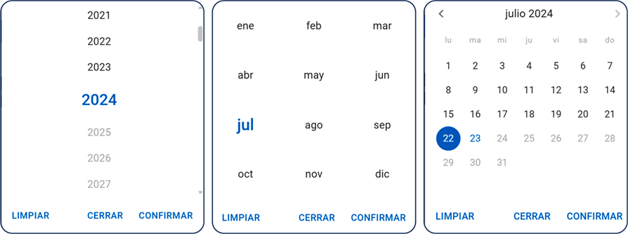 La segunda opción es dar clic sobre el icono de calendario dentro del filtro y se desplegará la ventana modal de elección de año -> mes -> día, primero se debe seleccionar el año dando clic sobre este mismo, luego se seleccionará el mes y posteriormente el día que se quiere revisar: