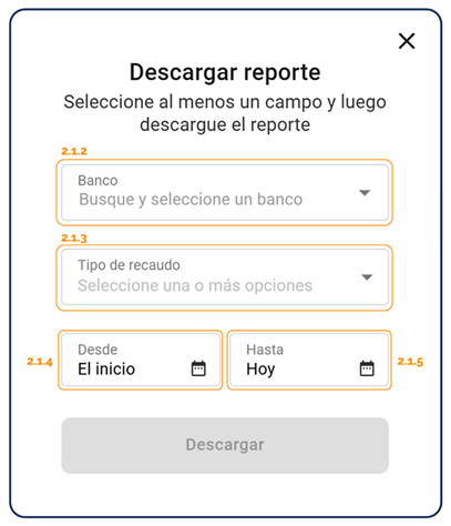 Botón “Descargar reporte”: a través de este botón los funcionarios de la entidad podrán descargar el reporte de recaudo, personalizado con los filtros que escoja en la ventana modal “Descargar reporte”. Al dar clic se desplegará una lista con 3 opciones, Archivo CSV, Archivo TXT y Archivo XLS, se debe escoger en que formato se desea descargar el reporte, al dar clic sobre el tipo de formato se desplegará la ventana modal “Descargar reporte”: