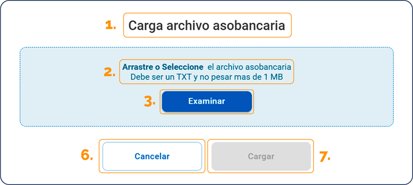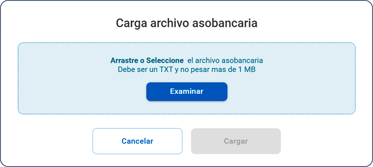 En esta ventana se debe cargar el archivo Asobancaria teniendo en cuenta las especificaciones descritas en el recuadro azul claro, se puede realizar de dos maneras: arrastrado el documento desde una carpeta local, o dando clic sobre el botón “Examinar”, al cargar el archivo y que cumpla con las especificaciones se habilitara el botón “Cargar” se debe dar clic sobre este para finalizar el proceso.