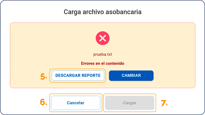 Botón descargar reporte, permite descargar el reporte de los errores que se tienen en el archivo cargado. Este botón se muestra únicamente cuando la modal está en estado con errores.