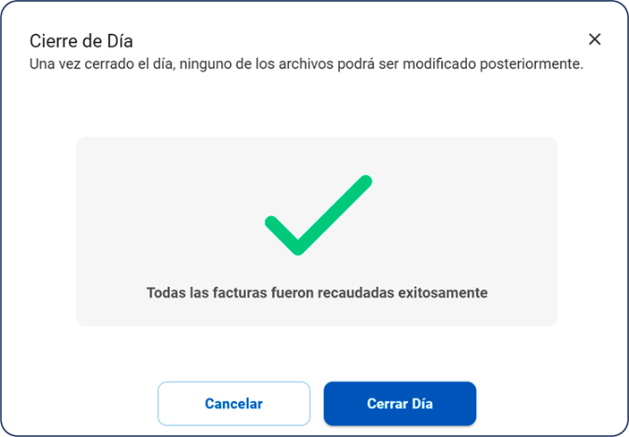 2.3. Botón “Cerrar día”: a través de este botón los funcionarios de la entidad podrán cerrar el día de operación en cuanto al recaudo de dicho día. Se ejecuta con el objetivo de cerrar operaciones. Se debe tener en cuenta que: