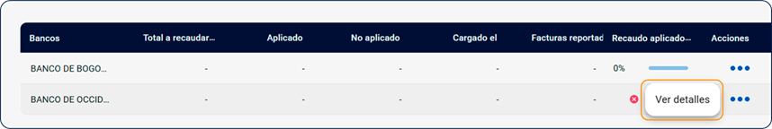 Títulos de columnas: en orden de izquierda a derecha se encuentran, Bancos, Total a recaudar, Aplicado, No aplicado, Cargado el, Facturas reportadas, Recaudo aplicado, y Acciones. Esto corresponde a la información que se encontrara en la respectiva columna en cada uno de los bancos de la entidad (filas). Las columnas tienen ordenamiento, es decir dando clic al lado del nombre permite ordenar de forma ascendente y descendente.