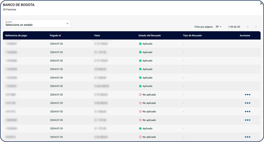 Estado del recaudo: muestra el estado en el que se encuentra el cargue del recaudo, puede ser: Aplicado, Duplicado, Inconsistente y No aplicado.