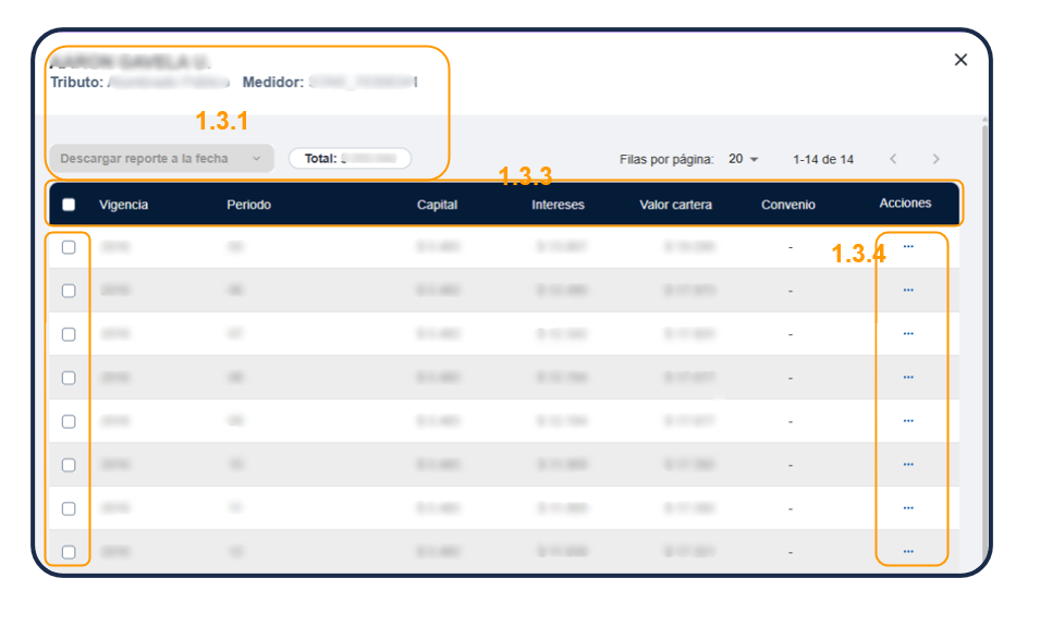 1.3.3 Títulos de columnas: En orden de izquierda a derecha se encuentran, columna de checkbox, Vigencia, Periodo, Capital, Intereses, Valor cartera, Convenio y Acciones. Esto corresponde a la información que se encontrará en la respectiva columna en cada uno de los periodos de la cartera del contribuyente (filas). Las columnas tienen ordenamiento, es decir, dando clic al lado del nombre permite ordenar de forma ascendente y descendente.