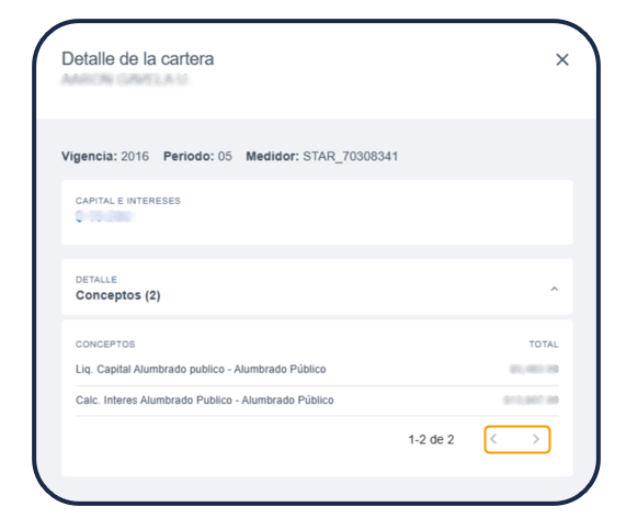 ● La ventana modal detalla el periodo específico seleccionado de la cartera del contribuyente; se da información sobre la vigencia, periodo, medidor y el capital e intereses.