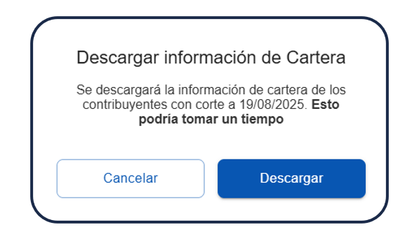 Seleccionar el formato con el cual se va a descargar, luego se detalla la ventana que informa que se descargara la información de cartera con una fecha de corte al día en que se realiza la gestión.