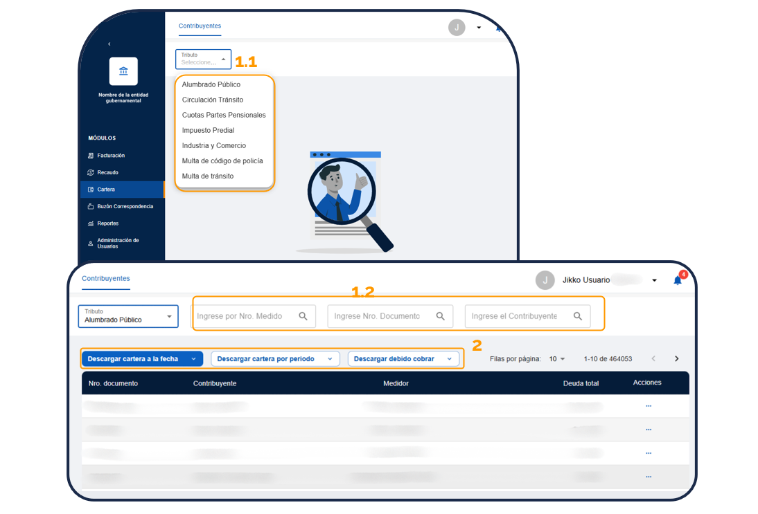 1.1 Barra de Filtros Tributos: en la parte superior se encuentra la barra con la opción de desplegar los tributos con los que cuenta la entidad. Desde aquí, se puede seleccionar el tributo correspondiente a la cartera que se está consultando. Al realizar la consulta, se desplegará la “Tabla contribuyentes con cartera”.