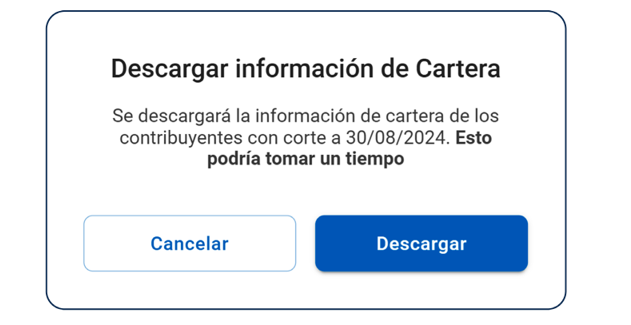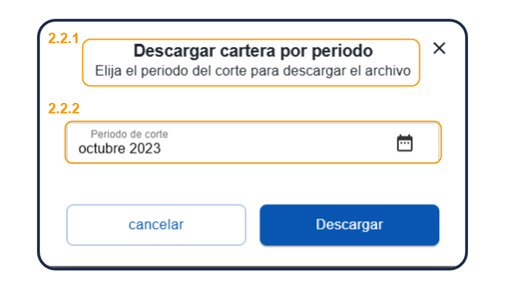 Al seleccionar el formato de descarga se despliega la ventana modal “Descargar reporte de cartera por periodo”: