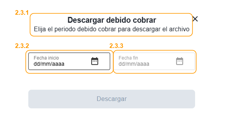 Al seleccionar el formato de descarga se habilita la ventana modal “Descargar debido cobrar”