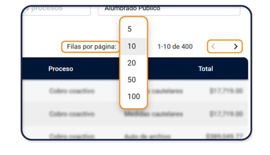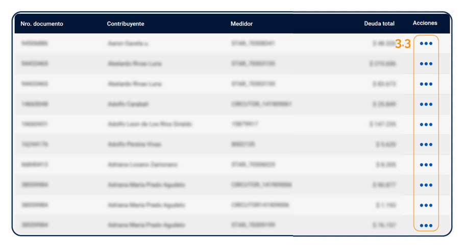 3.2 Contribuyentes con cartera (Filas): dentro de la tabla se encontrarán “n número de filas”, cada una correspondiente a un contribuyente con deuda con la entidad, dentro de cada una de estas en la última columna se encontrará el botón “Acciones” el cual es clicable.