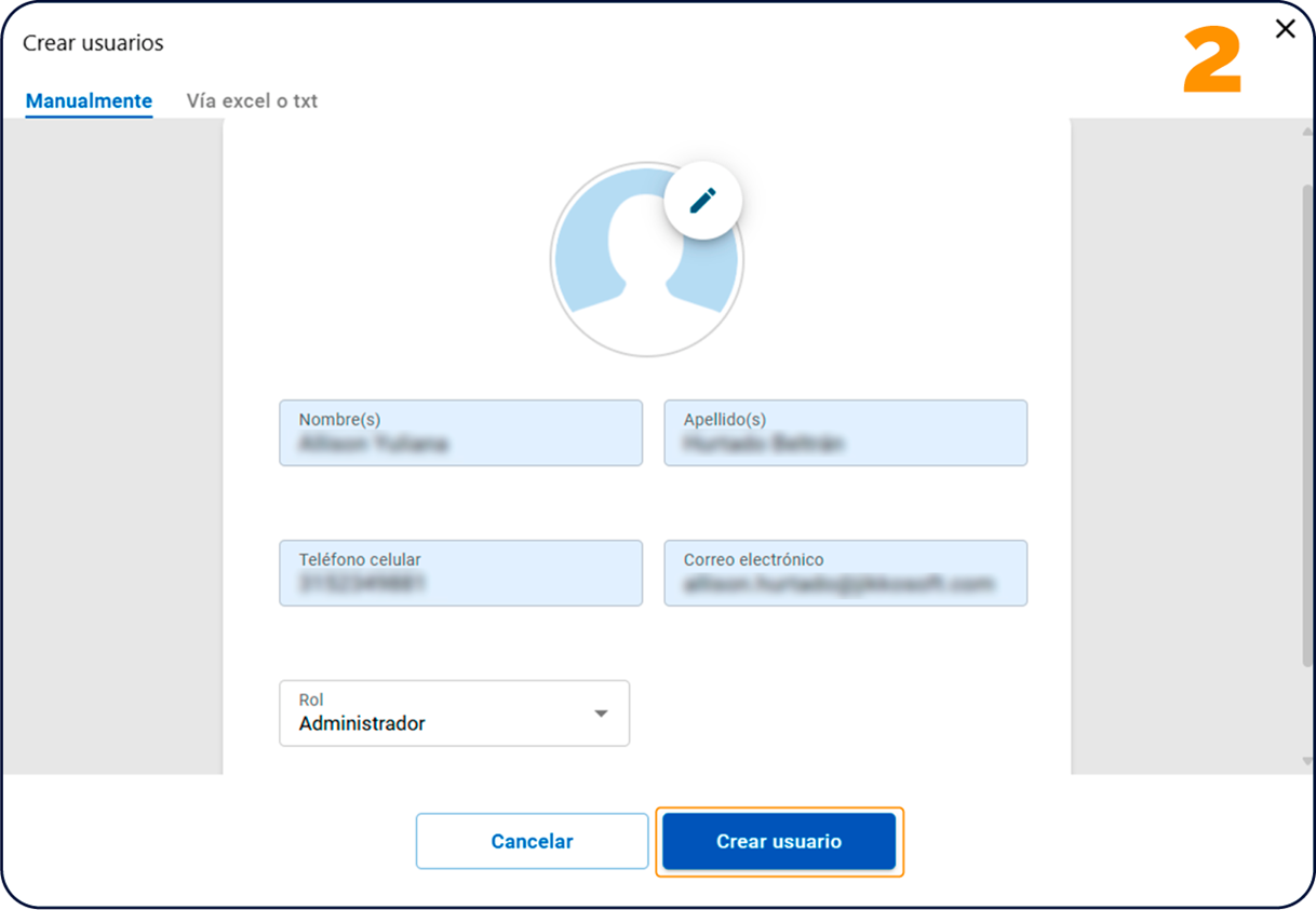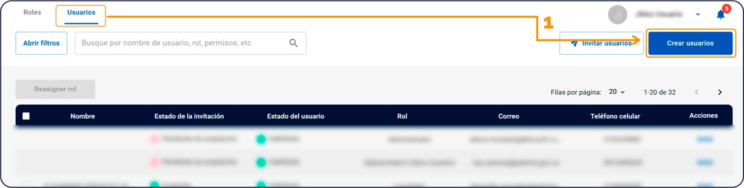 Botón “Crear usuario”: para crear usuarios se debe ingresar al tab “Usuario“ y luego dar clic sobre el botón “Crear usuarios”.